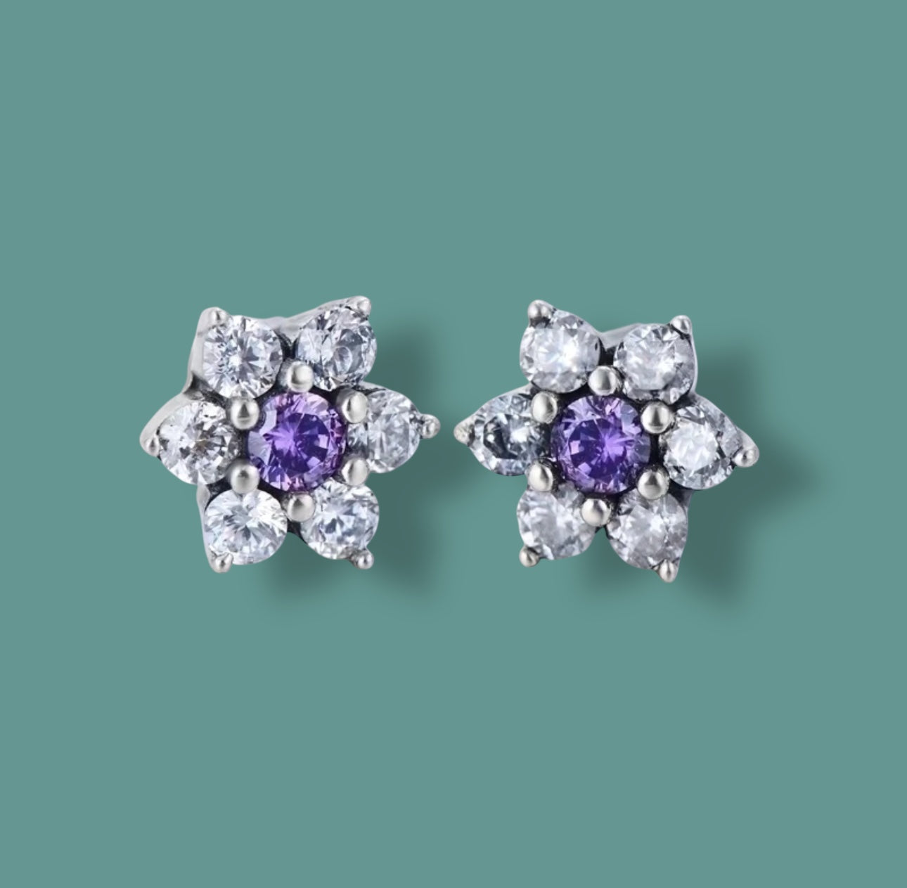 Klasszikus virágforma kristályokkal és egy színpompás lila kővel a középpontban. Kifinomult, mégis játékos megjelenést ad, akár hétköznapra, akár alkalomra viseled.