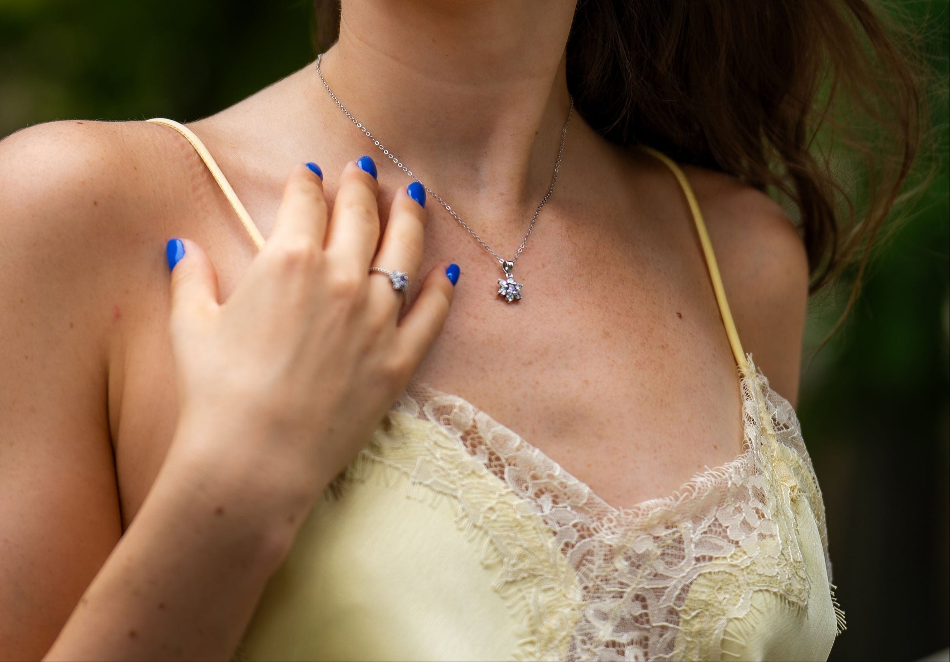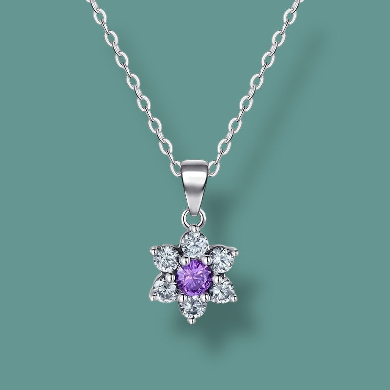 Egy finom és nőies nyaklánc, lila középkővel és körülötte ragyogó kristályokkal, melyek virágformát alkotnak. Tökéletes választás mindennapi eleganciához vagy különleges alkalmakra.
