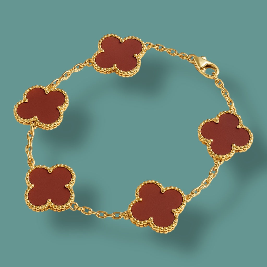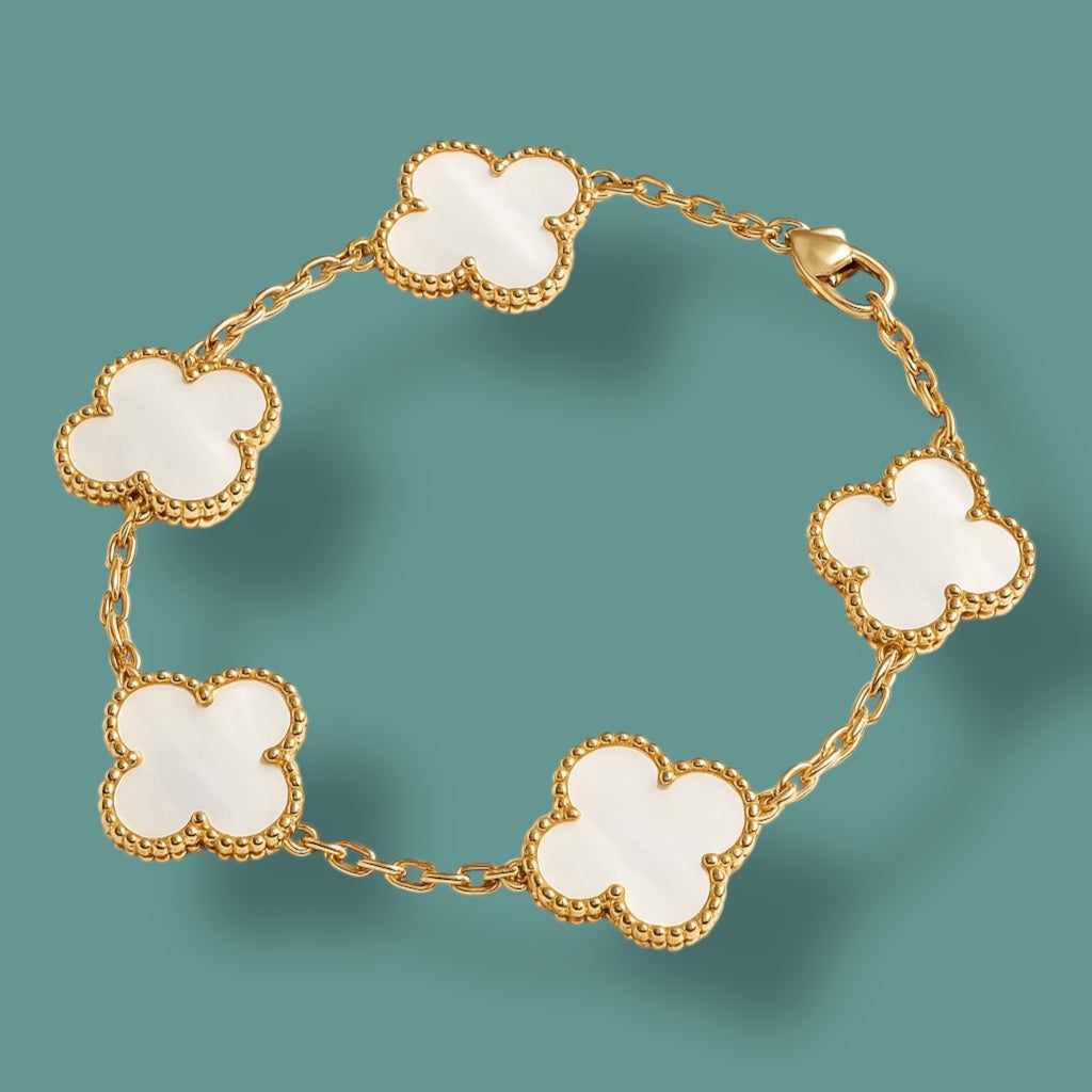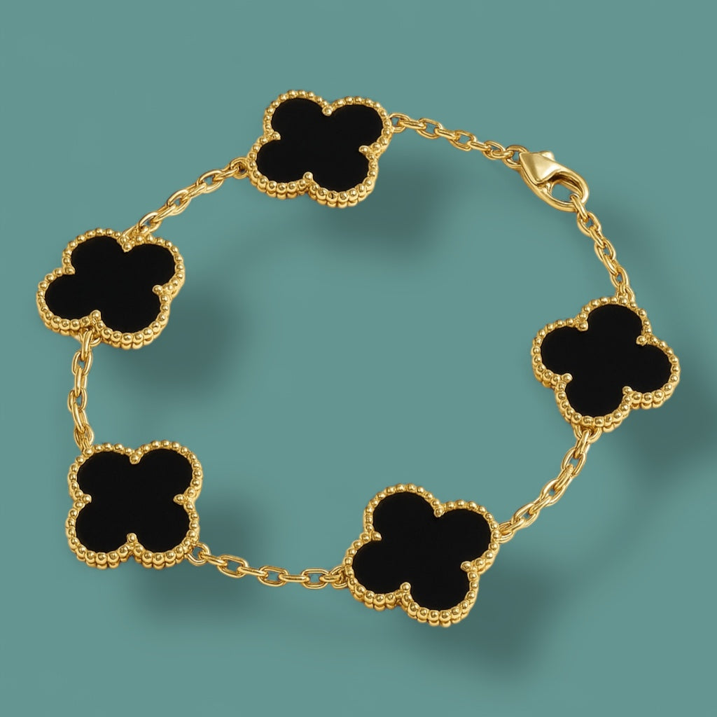 Egy karkötő, két stílus – te döntöd el, ma melyik oldalad mutatod. A finoman kidolgozott négylevelű lóherék egyik fele színes és elegáns (pl. fehér, burgundy vagy fekete), a másik oldala pedig arany tónusú, apró kövekkel kirakva – egy kis csillogás minden mozdulatban.