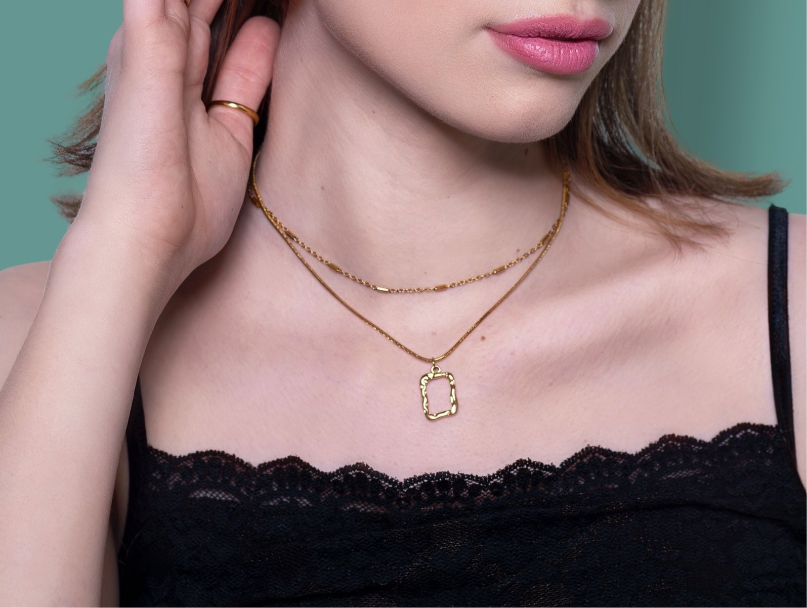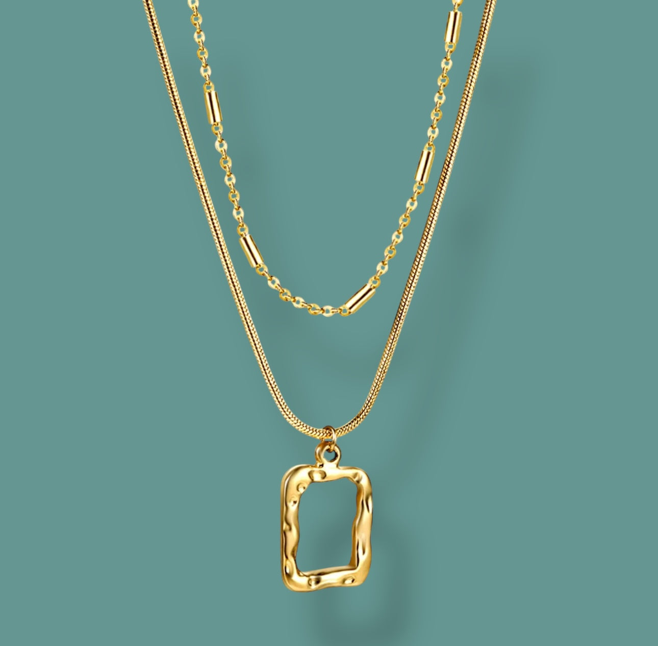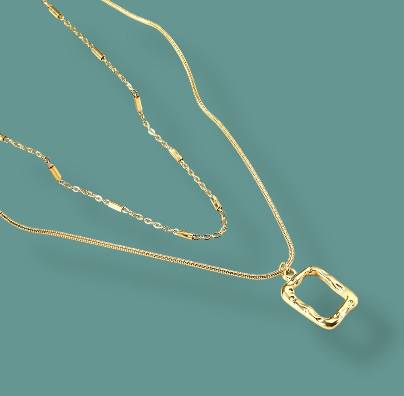 Tedd különlegessé a megjelenésed ezzel az elegáns, kétsoros aranyozott nyaklánccal! Az egyik lánc finom kígyólánc stílusú, amelyet egy modern, organikus formájú medál díszít, míg a másik vékony, láncszemes kialakítású, hengeres részletekkel.